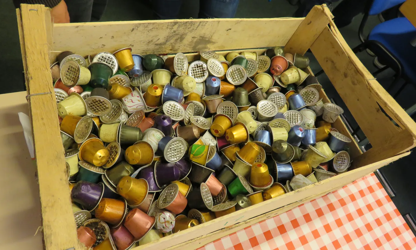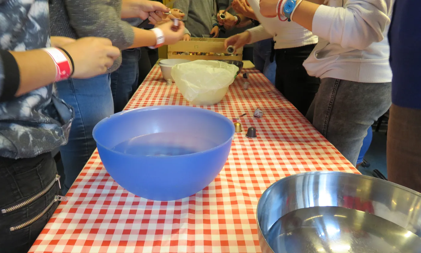 Autre atelier, autre ambiance. A la maison de la catéchèse, Anne-Catherine Menu et sa comparse animent une série d’activités en lien avec l’écospiritualité. le groupe de catéchumènes «Lac en ciel» du bout du lac de Bienne vient d’arriver. Ils ont timidement déposé vestes et sacs dans l’entrée et ont pris place à même le sol. Les animatrices sont sur le point de commencer quand un second groupe fait son entrée. Ils sont en retard. Ce matin, dans la salle de gym qui les accueillait pour la nuit, le réveil s’est fait aux aurores, mais le petit-déjeuner, lui, n’a jamais pointé le bout de son nez. Au programme de l’atelier, du bricolage autour de capsules de café. Elles sont violettes, vertes ou orange. Leur opercule est percé. Entassées dans une cagette de bois, les capsules semblent attendre leur triste sort. Les animatrices parlent de l’importance du recyclage sous le regard ensommeillé des jeunes assis en tailleur. Pas le temps de rejoindre les bras de Morphée, on se traîne jusqu’à la pièce du fond aménagée pour l’occasion. Sur les tables recouvertes de toiles cirées, perles, pistolets à colle, planches en bois et morceaux de caoutchouc. Départ. On nettoie et on écrase les capsules de café, on sélectionne des perles, on choisit sa ficelle de caoutchouc. On rit un peu, on oublie beaucoup les consignes. Pendant deux heures, on crée, à partir de matériaux de récupération des petits pendentifs, souvenirs déjà destinés aux parents.
