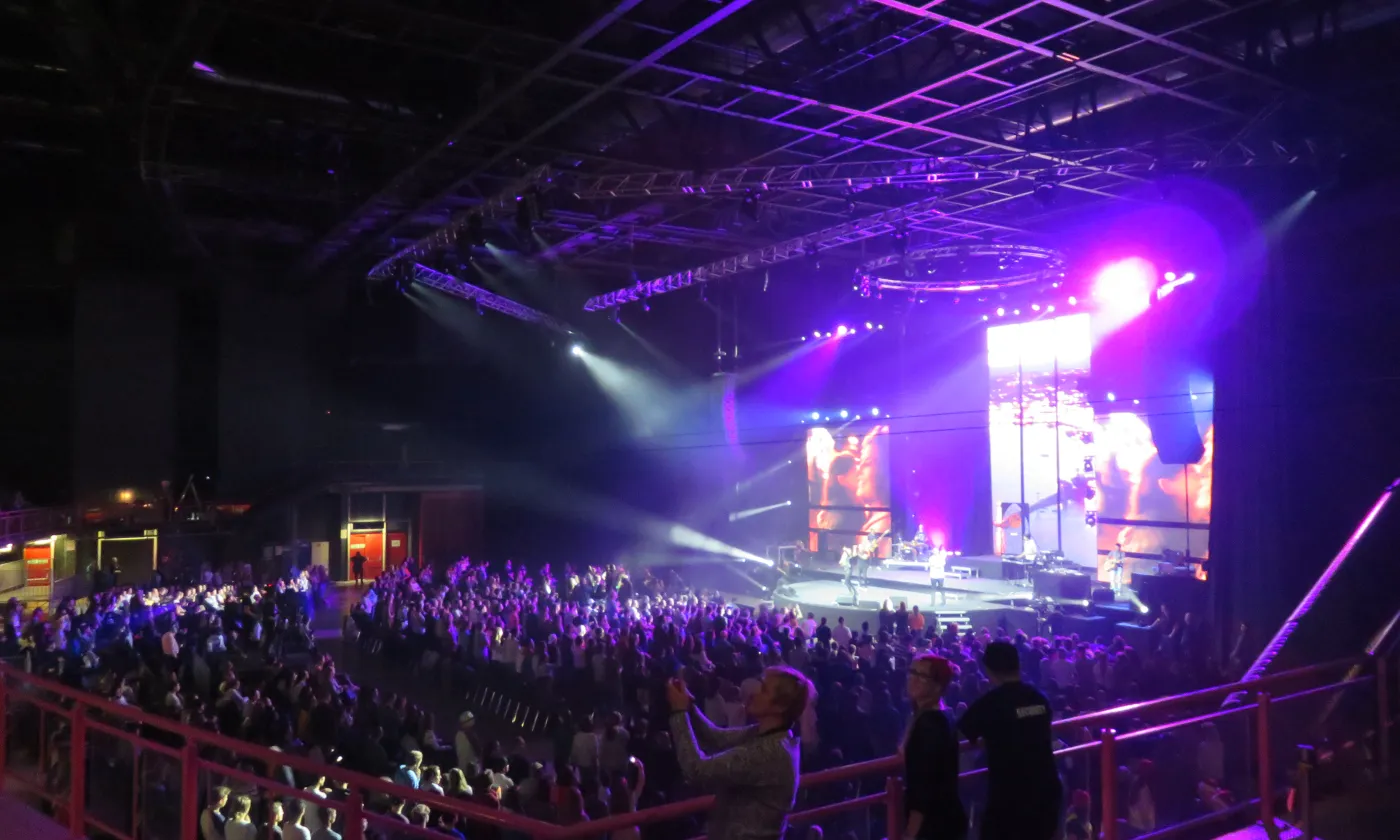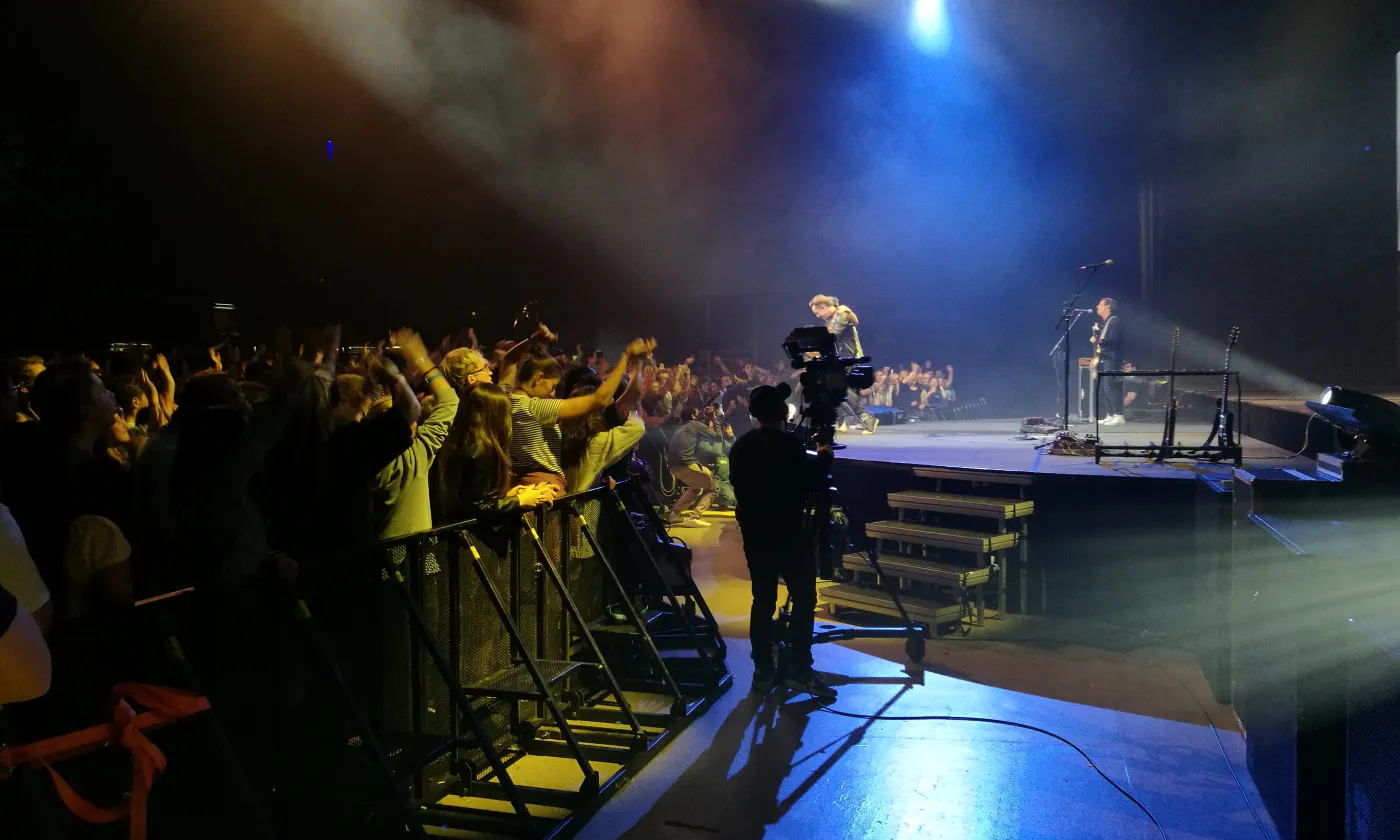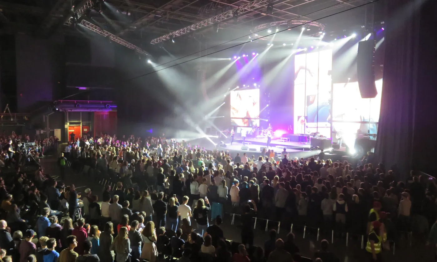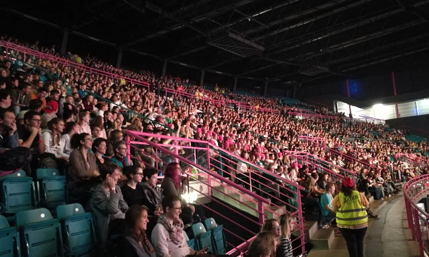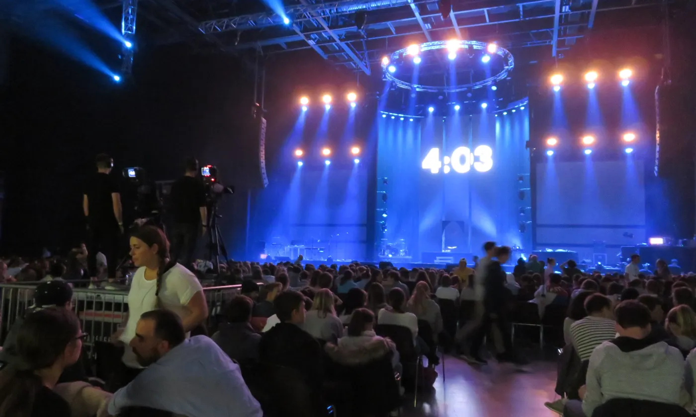 La chose se confirme en début d’après-midi. Les festivaliers et leurs accompagnants se retrouvent à l’Arena, une des plus grandes salles de concert de Genève à deux pas de l’aéroport. Derrière les portes tambour, c’est la cohue. Il faut montrer patte blanche. On tend son poignet, on montre son bracelet, avant de dévoiler le contenu de son sac au personnel de sécurité. On accède ensuite à un grand hall dans lequel flotte une odeur de churros et de crêpe au sucre. C’est là que se trouvent les stands missionnaires DM- échange et mission et Mission 21. Sur une petite estrade, une animatrice commente un match de  «Bubble Soccer» tout en souhaitant la bienvenue aux nouveaux arrivants. «Welcome to Reformaction», répète-t-elle régulièrement dans un anglais aux intonations suisses allemandes. Dans un coin, une partie du staff finit d’installer la boutique à goodies de Switchfoot, le groupe de rock chrétien dont le concert débutera à la nuit tombée. On pénètre enfin dans la salle obscure où près de 4600 personnes sont en train de prendre place. Tout le monde est assis. Plus une chaise de vide dans le parterre. Les gradins sont assaillis. Sur un écran géant un chronomètre égrène les secondes jusqu’au coup d’envoi.  «Füf! Vier! Drü! Zwöi! Eis!»: le public scande le décompte et le show, tel une montre suisse débute à 15h pile sous un tonnerre d’applaudissements et de cris stridents.
